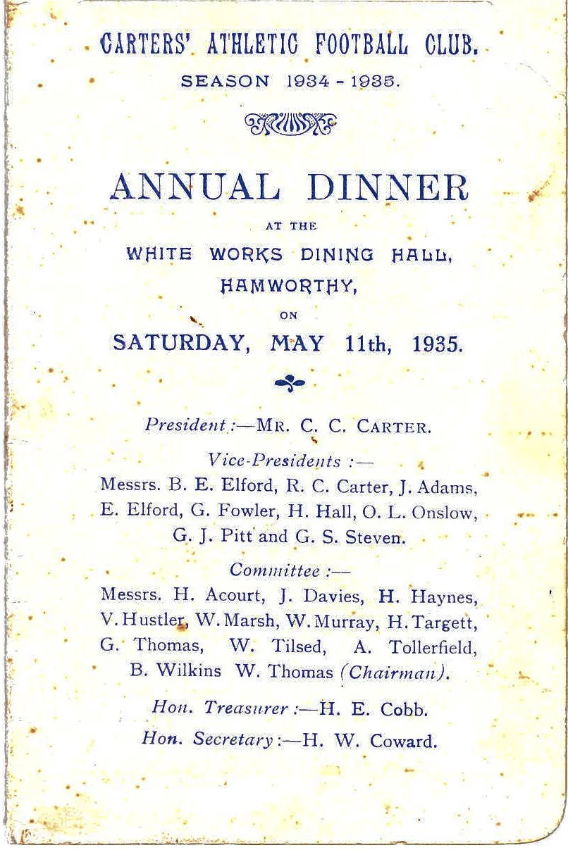 Carters’ Athletic Football Club annual dinner menu, 1934-35